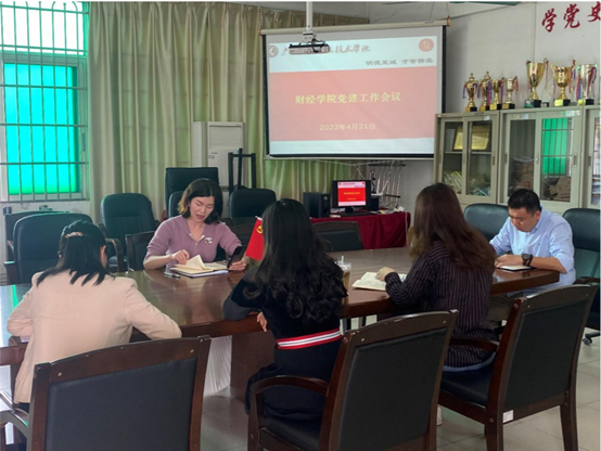 为深入推进财经学院党建工作,研究部署近期重点工作 任务,4 月 22 日下午,财经学院党总支线上线下同步召开财 经学院党建工作会议。全体党总支支委、教师党支部书记参 加了会议。