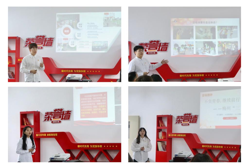紧接着,四位学生党员代表分别通过自己感悟和身边“战友”的事迹来分享:“德诚才精”志愿服务队队长,21级财富C班卓铁钊,他以《投身流调,无怨无悔!》为题进行分享,他说道:“作为一名退伍军人、也是一名流调志愿者,疫情就命令、防控就是责任,我的工作就是通过数据来对比疫情之下流调对象们的每条轨迹。这些步骤看似平凡而琐碎,却细致地编织着公共安全的“防护网”。我感动于团队的志愿者一直以来的默默奉献,也很荣幸能切身参与到流调工作中。”;财经学院团委学生副书记、校红十字会工作人员,21级财管B班林泽如以《核酸检测开始后,你我都被感动了!》为题进行分享,她说:“我们从早上六点半到晚上八点半,分成四班,连续一周,全程在岗,时刻保证校园核酸检测有条不紊地进行。成员们穿着厚重的防护服,戴着口罩,说话很不方便,但是工作中的交流仅靠着眼神和动作就能传达到位,体现着成员之间长期合作形成的友情和默契。”;21级财管B班肖晓慈以《不负青春,继续前行--梅州“三下乡”之行》为题进行分享,她说:“三下乡”社会实践活动,让我们明白:“基层需要大学生,大学生也需要去基层”,仅仅有点书本知识是不行的,基层能够锻炼人,将人的优秀品质充分展现,通过基层锻炼,志愿者提高了社会实践能力。这次活动让志愿者得到了很多的锻炼,获得了很多的快乐,极大地丰富了我们的暑期生活。”;财经学院信息中心负责人,21会计A班张梓骐以《不同人眼中的雷锋精神》,他说:“每个志愿者都是我们身边的“平凡英雄”,镜头中每个忙碌的身影,都让人肃然起敬,在忙碌中履职尽责,他们渴望着为这个校园、社会尽一份绵薄之力,为素未谋面的陌生人,展露一个温暖的笑容,无关利益只关乎责任与奉献。财经学院志愿者们以实际行动,践行着“奉献、友爱、互助、进步”的志愿精神,感谢他们的付出与奉献!”