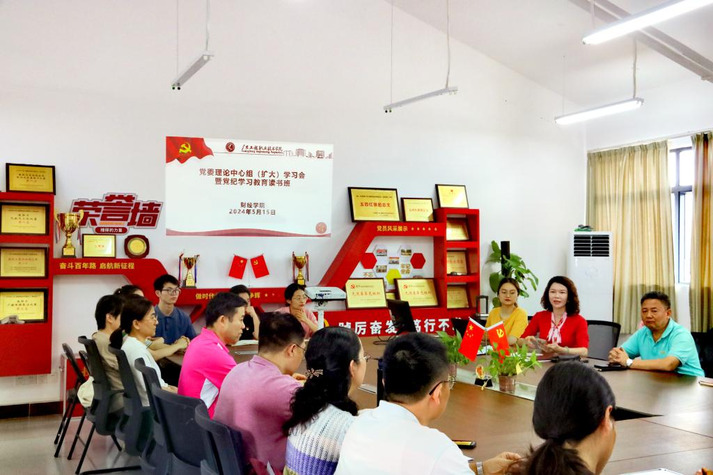 5月15日下午,财经学院党委在省职教城校区教学楼4号楼618召开党委理论学习中心组(扩大)学习会暨党纪学习教育读书班,深入学习新修订的《中国共产党纪律处分条例》。财经学院党委委员、各党支部支委以及组织员参加会议,会议由学院党委书记吴丽清主持。