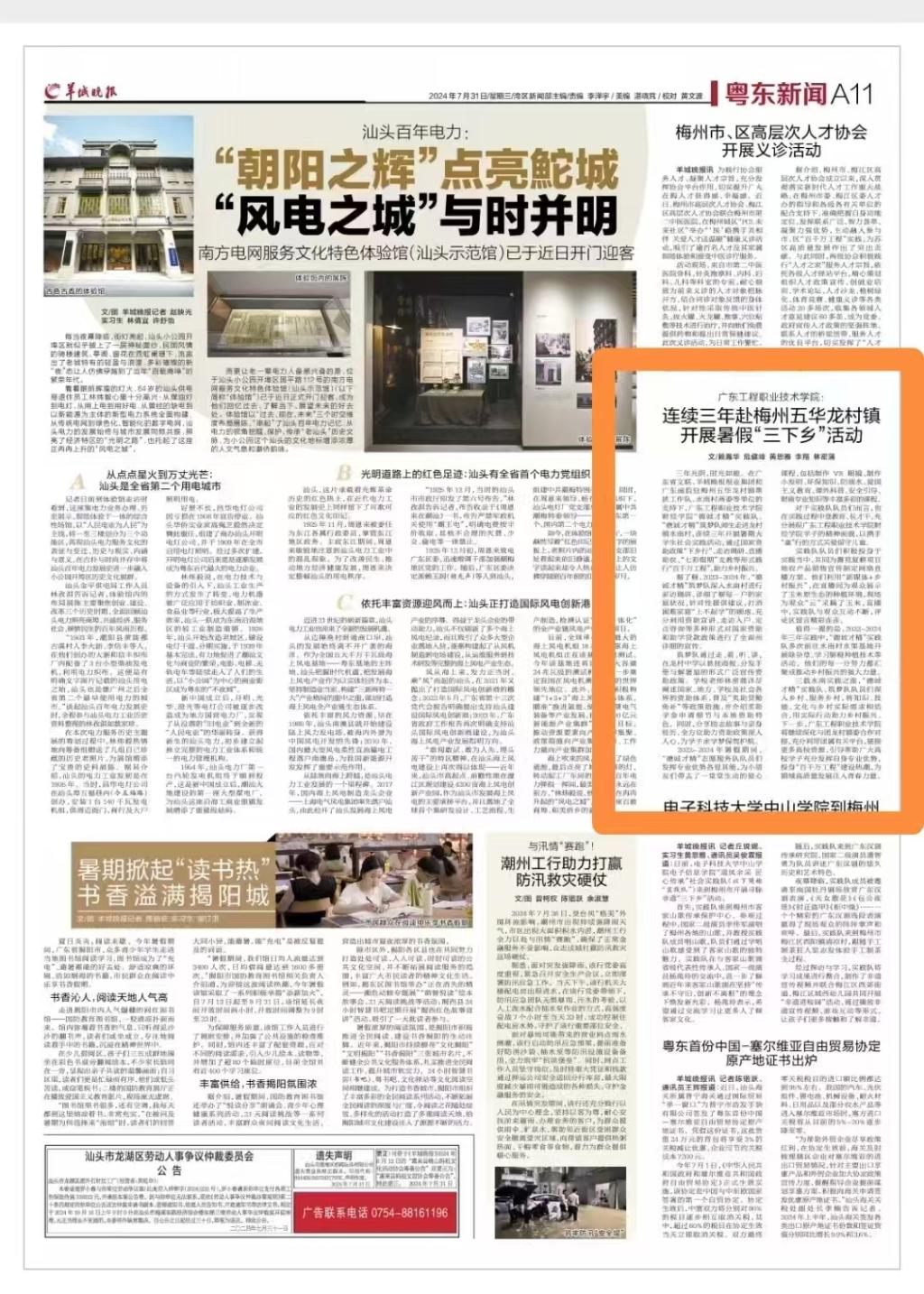 三年光阴,时光如梭,广东工程职业技术学院财经学院“德诚才精”实践队、“德诚才精”筑梦队师生走进粤东山区梅州市五华县龙村镇水南村,2022-2024年连续三年开展乡村振兴系列暑假大学生社会实践活动,通过国家资助政策“下乡行”、走访调研、直播助农、“七彩假期”支教、走访慰问、村民座谈等形式践行“百千万工程”,助力乡村振兴。近期,《人民日报》《羊城晚报》《南方+》《广东教育》《无线梅州》《五华新闻》等多家主流媒体报道我院连续三年赴梅州开展暑假“三下乡”实践活动情况。其中,7月31日出版的《羊城晚报》在A11版刊发专题报道。