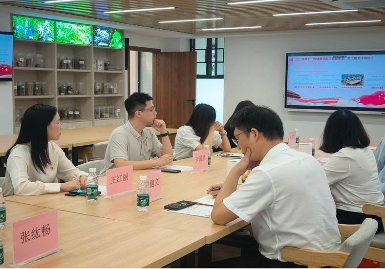 参观结束后,双方在中药标本馆举行了交流座谈会,双方聚焦基层党建提质增效的核心议题展开深度对话。利健文书记详细介绍了中药学院党总支立足中药文化,在标准化规范化建设、党建品牌凝练、“三会一课”制度落实以及主题党日活动设计等方面的系统性经验与特色成果。