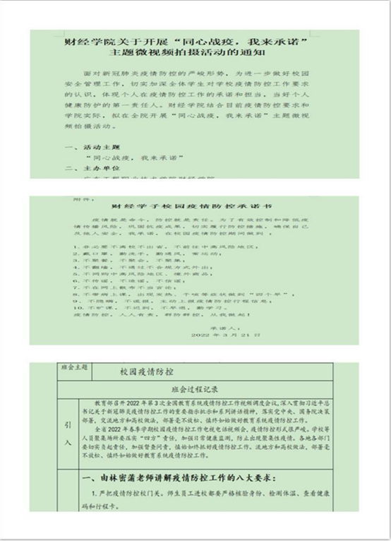 为引导全院学生以积极乐观的生活态度去面对当前疫情下的生 活,去发现校园生活中的美好,财经学院将组织全体学生以宿舍为单 位参加“同心战疫,我来承诺”主题微视频创意大赛、签订《财经学 子校园疫情防控承诺书》,并通过我院公众号展示大家抗疫生活的同 时,传播正能量,弘扬抗疫精神。通过此活动,加深全体同学对疫情 防疫工作要求的认识,体现个人在疫情防控工作的担当,当好个人健 康防护的第一责任人。