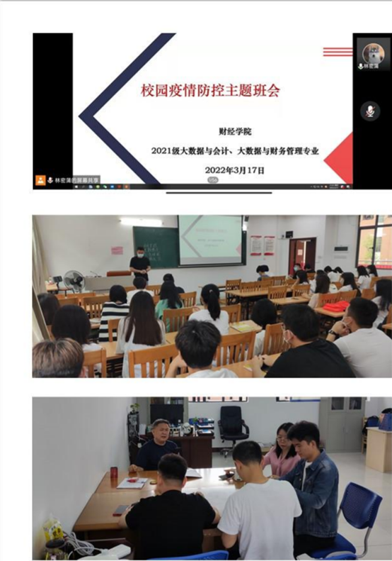 3 月 17 日,财经学院全体辅导员分别通过线上线下相结合的方 式,召开所带班级的疫情防控主题会议,传达学校关于强化疫情防控 工作的通知精神,明确学校疫情防控管理要求。3 月 17 日-21 日期间, 各班班主任响应学院统一部署,分别召集班级开展疫情防控线下主题 班会和班干部、宿舍长工作会议,布置学校疫情防疫工作,保证每位 学生听进去、听明白。针对此次疫情防控工作,财经学院试行班级三 级管理制度(即一级:班长,二级:班干部;三级:宿舍长;一级管 理员每晚 11 点前向辅导员汇报学生在宿舍情况),筑牢疫情常态化管 理的网格化学生管理模式。