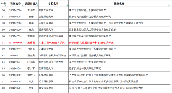 近日,教育部高等学校科学研究发展中心公布“中国高校产学研创新基金-北创助教项目(二期)课题资助公告”,我校财经学院王胜利团队获得了课题资助立项,课题资助金额为10万元。该项目是财经学院与金蝶精一信息科技有限责任公司的校企合作产教融合的成果之一,双方共同组建团队申报课题,而且金蝶精一公司是课题基金资助方之一。课题团队成员有王胜利、魏佳丹(金蝶)、苏志鹏、欧阳洲、何锦漫(金蝶)。