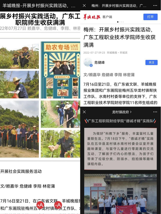 7 月 16 日-21 日,在广东省文联、羊城晚报报业集团和广东画院驻梅州五华龙村镇帮扶工作队、水南村村委等单位的支持下,广东工程职业技术学院财经学院 11 名师生组成的“德诚才精”暑假三下乡社会实践队(以下简称“实践队”)走进山村,开展为期 6 天的乡村振兴暑假大学生社会实践服务活动,通过调研、直播助农、支教、慰问、座谈等形式助力乡村振兴。实践队在梅州五华龙村镇开展的乡村振兴系列社会实践活动同时获羊城晚报粤东新闻栏目、羊城晚报·羊城派新媒体和龙村镇政府公众号报道。