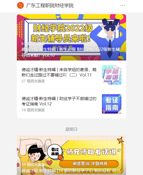 为使新生提前知晓报到流程、了解学院、熟悉新生辅导员,打造有“温度”的迎新,用爱心和责任心,让家长舒心、让学生安心。学院通过公众号向新生发送了“德诚才精”新生特辑系列《萌新看这里 手把手教你如何进行团组织关系转接》、《Hi新的财经学子们 新的征程 师兄师姐有话说》、《嘟嘟 媒媒牌观光车带你提前逛校园》、《新生必看 财经学院2022级新生辅导员来啦》等十余期图文并茂的推文。新生报到当天,学院也早早做好了迎新点的相关布置工作,通过“德诚才精”文化墙,对学院的整体概况、文化理念、党建品牌等进行展示,帮助新生方便快速浏览学院专业设置、人才培养方案、学院品牌活动和理念,提前了解财经学院文化和专业发展前景,专门特制了“德诚才精”文件袋,内含新版学生手册、文化品牌徽章、给新生的温馨提示,防诈骗资料、科普升学书页等。学院以周到细致的方式表达了对新生们的热烈欢迎。从学生所想所需出发,再到食宿安排,暖心的志愿帮助、让迎新工作凸显出了快捷、周到、热情的特点,展现了财经学院以学生为本,主动贴近学生、关怀学生、服务学生的良好形象。