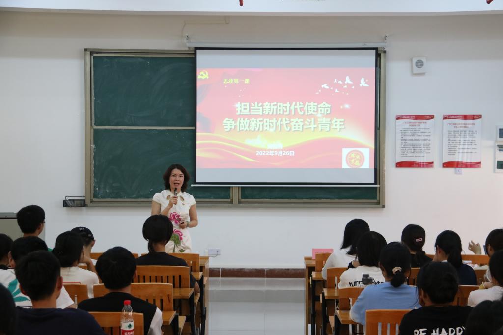 随后,吴丽清为新生们送上一堂主题为《担当新时代使命,争做新时代奋斗青年》的“思政第一课”。首先,她给新生们阐述了开展“思政第一课”的意义与内涵,号召在座大学生要关心国家大事和社会热点,了解当下国际格局和国家大事,加强学习与自我提升。