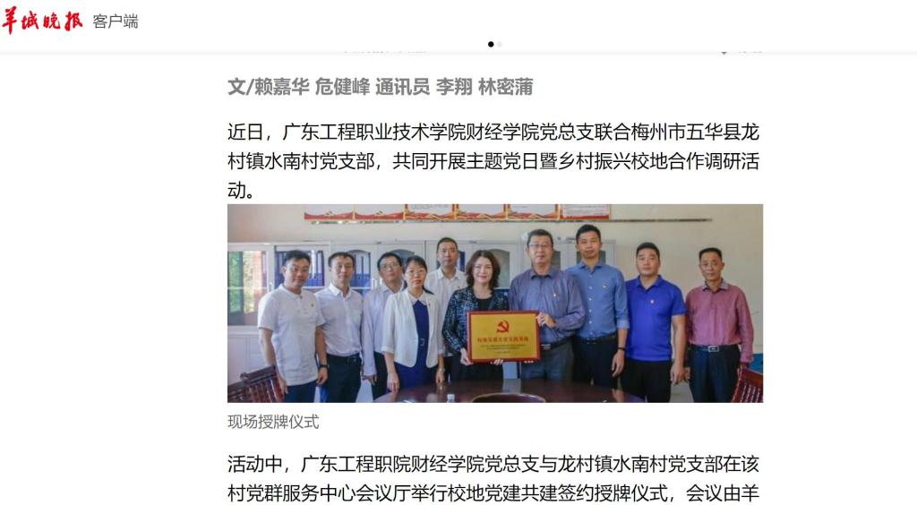 今年暑假,我院 11 名师生组成的“德诚才精”暑假三下乡社会 实践队来到梅州市五华县龙村镇水南村,开展为期 6 天的乡村振兴暑 假大学生社会实践服务活动,通过调研、直播助农、支教、慰问、座 谈等形式助力乡村振兴。暑假“三下乡”社会实践活动与水南村达成 了良好的合作效果,也奠定了下一步的合作意向。10 月 13-14 日, 财经学院党总支联合梅州市五华县龙村镇水南村党支部,共同开展 “喜迎党的二十大·结对共谱乡村振兴新篇章”主题党日暨乡村振兴校地 合作调研活动,该活动获得《羊城晚报》报道。