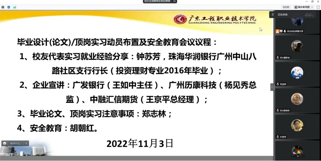 为进一步加强实习生的管理,切实提高学生顶岗实习质量。2022年11月3日,我院采取线上的方式,分专业召开了2023届毕业生实习动员会。参会人员有各专业负责人、顶岗实习指导老师、相关专业班级辅导员以及2023届毕业生。