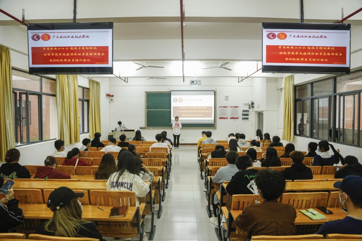 为深入学习践行党的二十大精神,进一步强化学风建设,筑牢学风建设育人共同体,浓厚学风氛围,我院于11月24日在省职教城校区教学楼Q1-114召开了“学思践悟党的二十大 德诚才精树新风”学风建设活动月总结推进会暨纪律委员培训会议。学院全体辅导员、学生会纪律部成员、各班班长和纪律委员参加了本次会议。