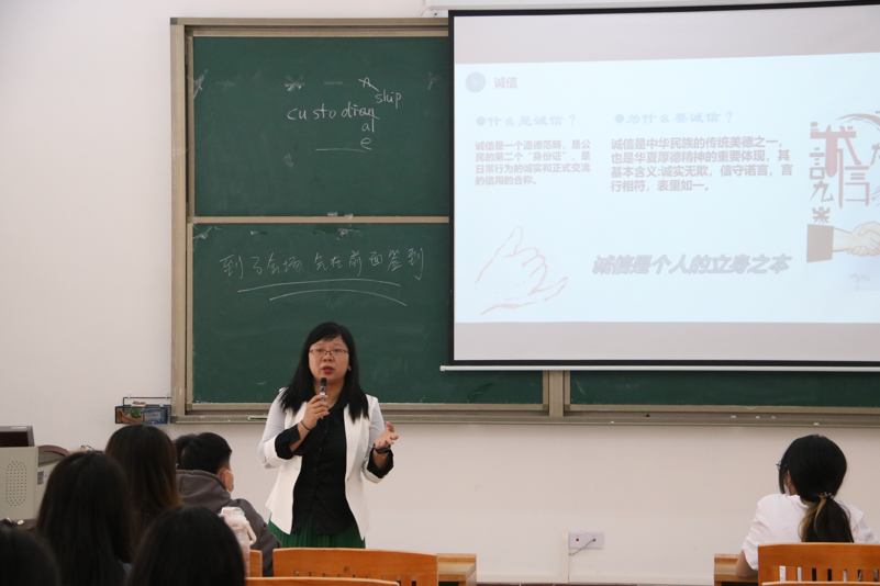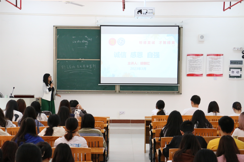 活动开始,胡朝红老师从“什么是诚信”开始,引出诚信的本质,提醒同学们要做诚实守信的人,同时落实在实际学习生活中,不迟到不旷课,真正做一个讲诚信的人。其次引导同学们要懂得感恩,以实际回报学校、社会。胡老师意以身边榜样与暑假“三下乡”社会实践活动以及“德诚才精”志愿服务团队以实际行动传播劳动知识,为群众办事;让同学们感受一下劳动,积极帮助他人以及参加公益活动的快乐;学习各类奖学金获得者的优秀品德,以身边的榜样为力量 ,懂得以实际行动感恩以及学习办公室礼仪教育,主动积极帮助他人。胡老师以自身求学期间受到贵人帮助的经历,告知同学们要懂得感恩;作为青年大学生一定要有目标,有理想;要勇于自我革命,自我批评;要积极向上,传播更多的正能量,做一个自强不息的人,受国家资助之后,要学会感恩,用实际行动回报社会,乐于助人,增强自身的社会责任感及使命感,努力学习、积极实践。