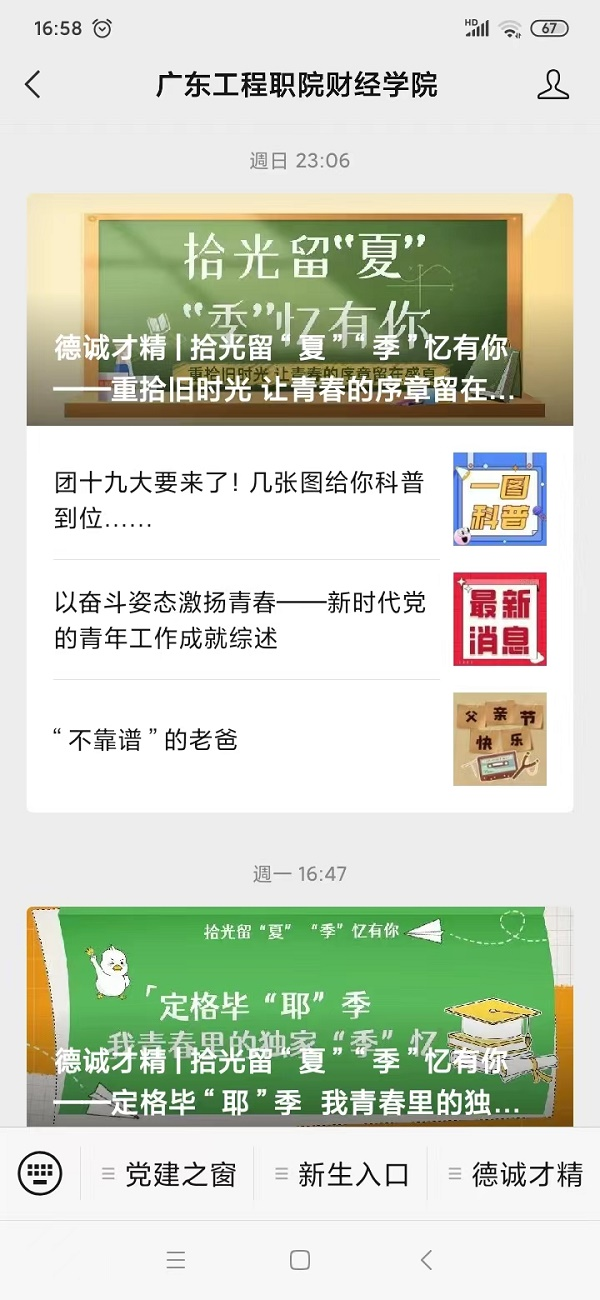 财经学院公众号自6月7日开始连续推出多篇毕业季系列推文,那都是专属于毕业生的独家回忆,里面有拾光留“夏”,夏“季”有你,定格毕“耶”季我青春里的独家“季”忆,有着为了毕业生记录美美回忆,以及“毕”不可少,这份团组织关系转接攻略你可接好咯!还有重要的毕业生防骗指南等各类毕业季资讯。