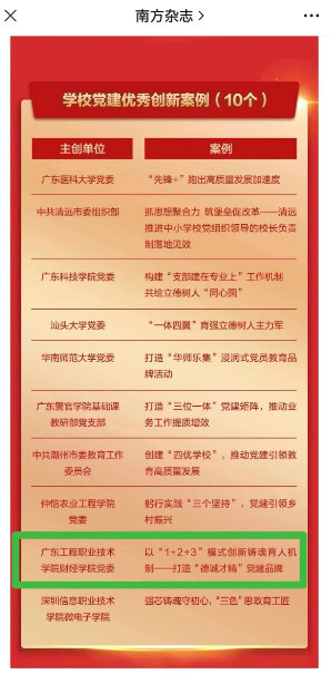 近日,第三届广东基层党建创新案例遴选结果公布,财经学院党委党建案例《以“1+2+3”模式创新铸魂育人机制——打造“徳诚才精”党建品牌》获第三届广东基层党建创新案例“学校党建优秀创新案例”,此次全省共10个学校党建案例入选。