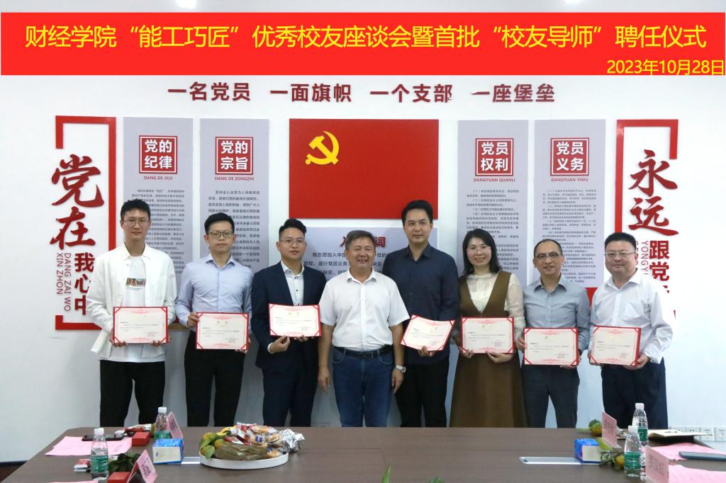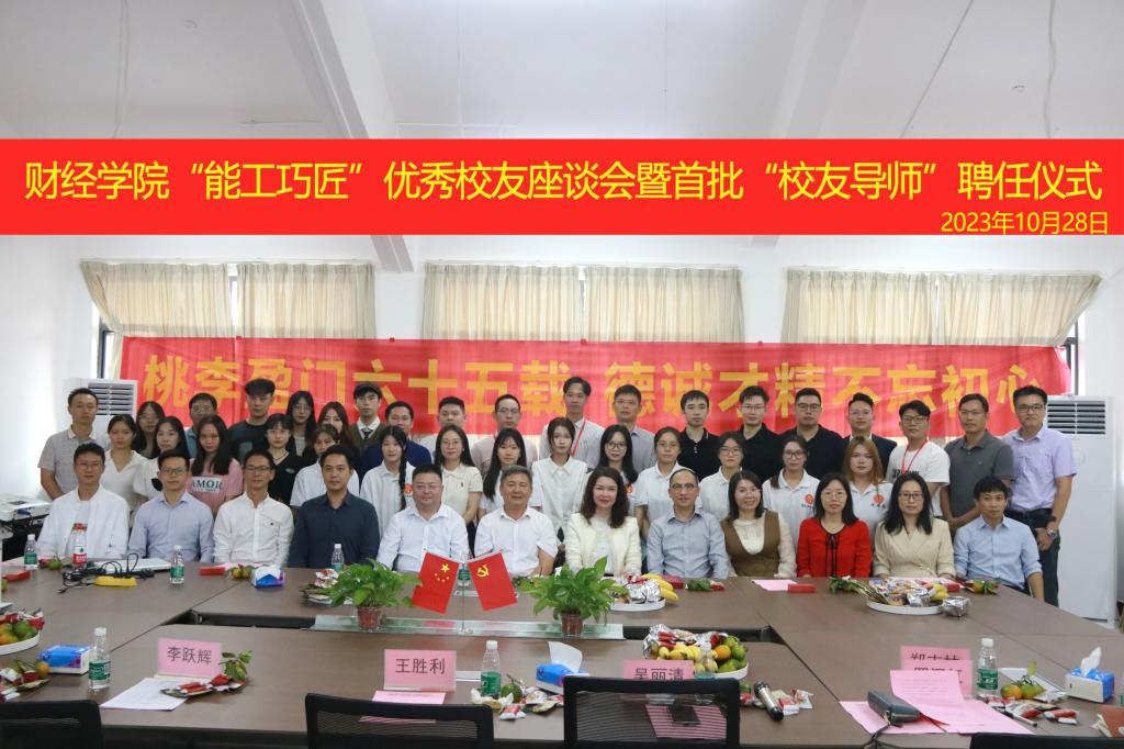 2018年10月28日下午,财经学院在教学楼4618室组织开展“能工巧匠”优秀校友座谈会暨首批“校友导师”聘任活动,学院领导班子、优秀校友代表、教师代表、学生代表共计60余人参加了座谈会,会议由党委副书记罗汉红主持。