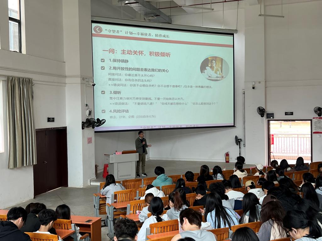 林峰老师讲到,要正确认识大学生常见心理问题,大一主要表现在适应困惑问题上,大二为心理问题多发期,人际关系冲突、学习压力、情感问题等多方面诱因,大三情感发展的冲突与择业求职的盲目所带来的心理困惑。主要从三个方面识别心理危机,认知出现问题,情绪异常,行为反常易失控。心理危机应对,一问二应三转介,主动关怀,积极倾听,适当回应,支持陪伴,找能够提供帮助的老师。