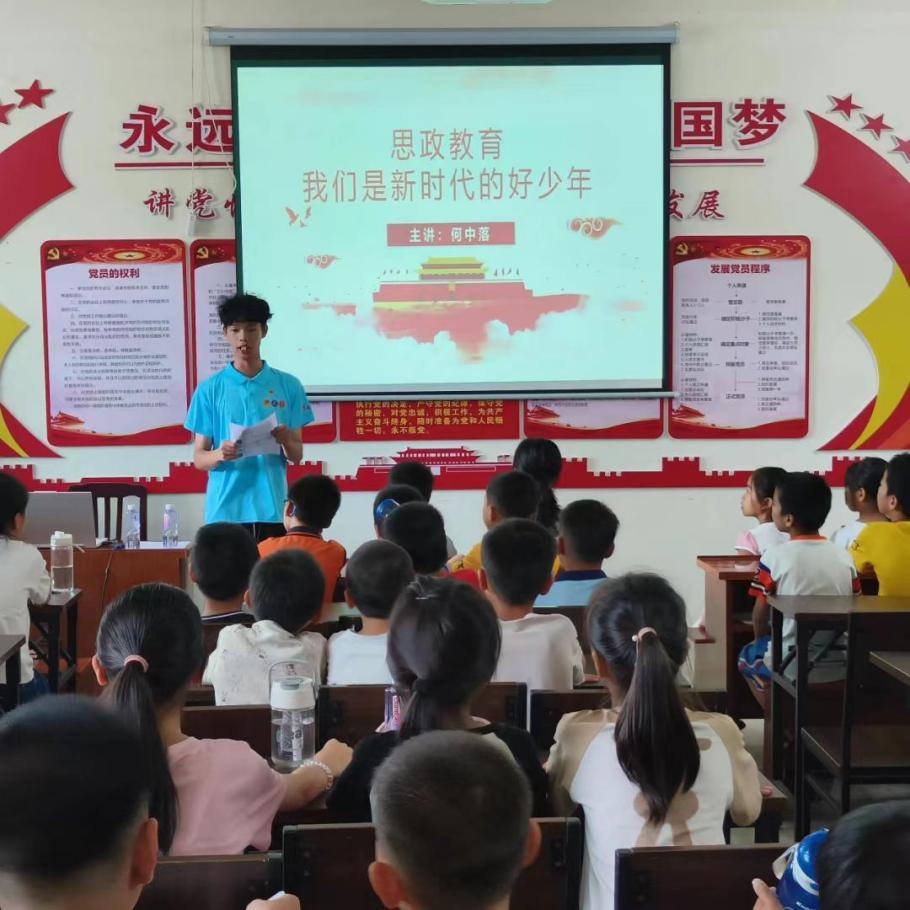 活动伊始,实践队为孩子们精心准备了一堂别开生面的“心灵启迪”红色思政课。实践队通过红色思政课堂加深了孩子们对党团知识和当地红色文化的理解,引导他们树立正确的价值观念。进行红色思想教育,旨在引领孩子们认识到:中国共产党百年奋斗的成功密码,正蕴藏在党为人民谋幸福、为民族谋复兴的初心和使命中,党紧紧依靠人民创造了如今的国家富强、人民幸福。为了让孩子们更好融入学习,支教团队安排学生自己动手制作个性化学生证和水位牌,座位牌上清晰地标注了每个孩子的姓名,学生证便于对孩子们进行身份识别,上面加注了孩子的基本信息,方便管理及联系。