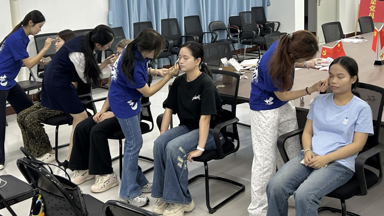学校化妆队则以 “面试得体妆容” 为核心,进行职业形象打造步骤化解析。现场邀请 6 名学生志愿者进行 “一对一” 妆容打造,化妆师边操作边讲解技巧,从肤质适配到工具选择,从妆容避雷到细节优化,让在场学生直观掌握简约职业妆的打造逻辑,实现从 “知道” 到 “学会” 的能力跃迁。