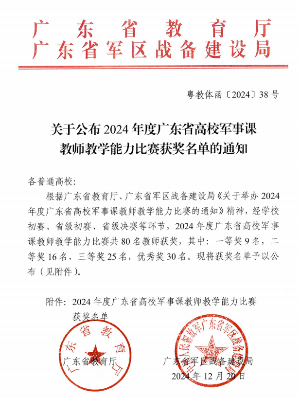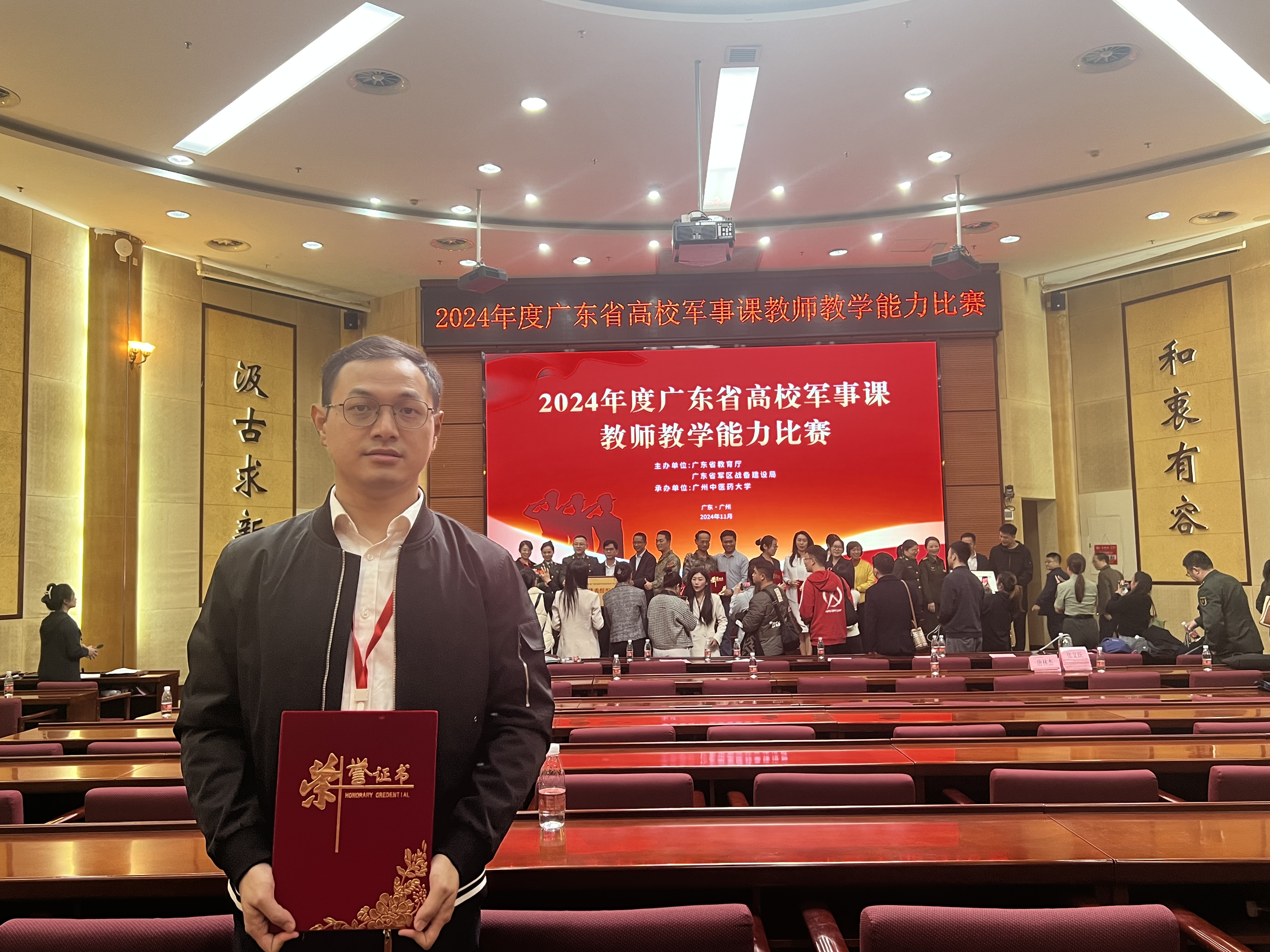2024年11月29-12月1日,由广东省教育厅、广东省军区战备建设局联合主办的2024年度全省高校军事课教师教学能力比赛(决赛)在广州中医药大学大学城校区举行。我校军事理论课教师查宇驰从全省51支高校队伍,80名参赛选手中脱颖而出进入决赛,经过军事理论授课、模拟射击、单个军人队列动作等环节的比拼,荣获全省二等奖的优异成绩。