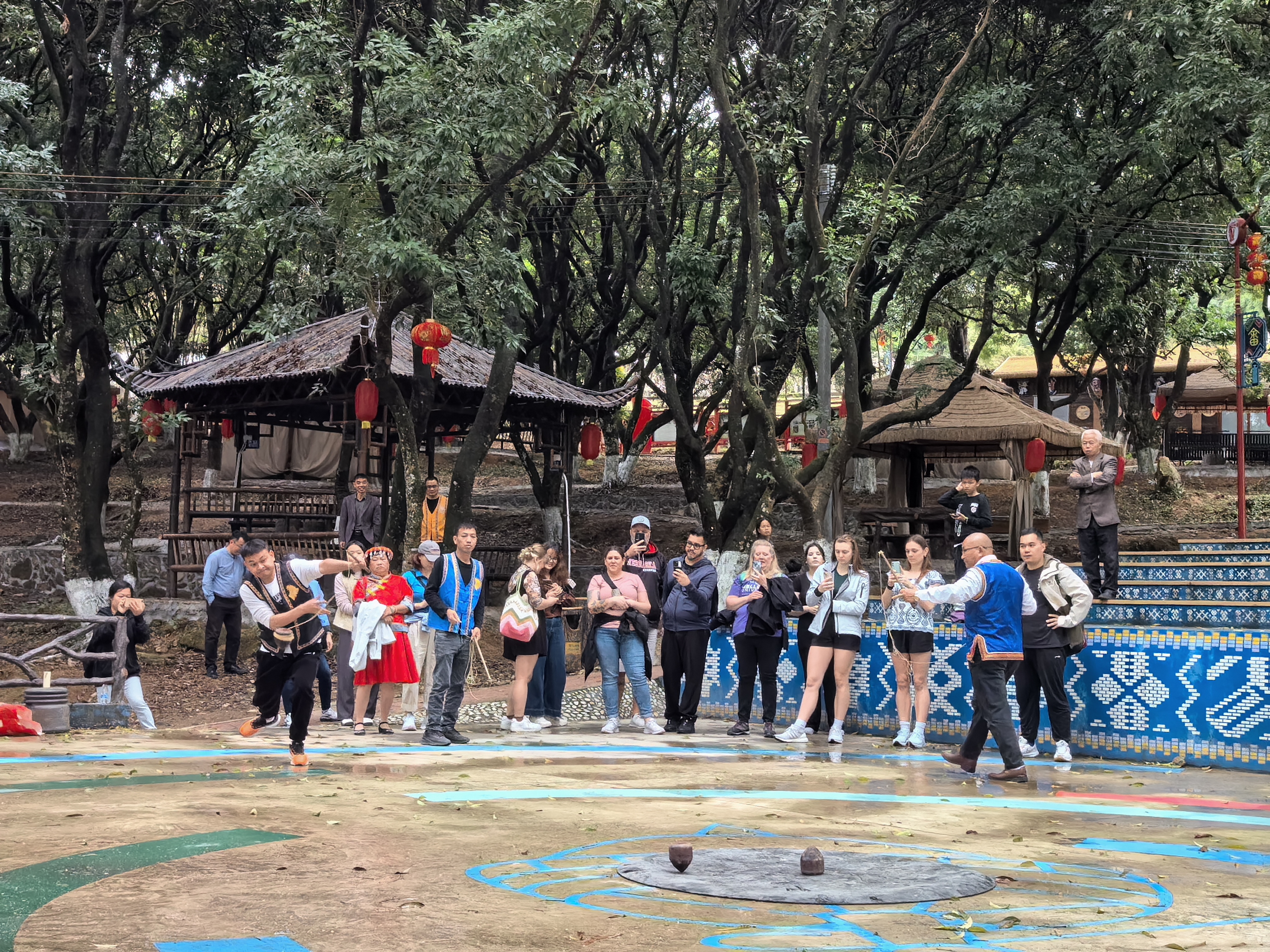 随后,交流团来到蓝屋畲族村,受到饶洋镇政府领导、省乡村振兴驻饶洋镇工作队、村委干部等热情接待。该村是我校结对帮扶的乡村振兴省级典型示范村,通过我校的大力支持,该村风貌焕然一新,游客络绎不绝。在省级重点文物保护单位泰华楼(畲族围屋),美国师生们被泰华楼独特的建筑风格和深厚的历史底蕴深深吸引。围屋前,他们欣赏并参与了畲族竹竿舞,感受着畲族人民的热情与活力。在后山公园,正值樱花盛开,美景如画,美国师生纷纷拍照留念。在陀螺场,他们饶有兴致地欣赏并体验畲族非遗传统体育项目打陀螺,现场气氛热烈。期间,饶平县第四中学的师生正在蓝屋畲族村开展“学雷锋,文明实践我行动”主题活动,他们主动与美国师生进行了友好交流,共话乡村振兴,共话大美南粤。