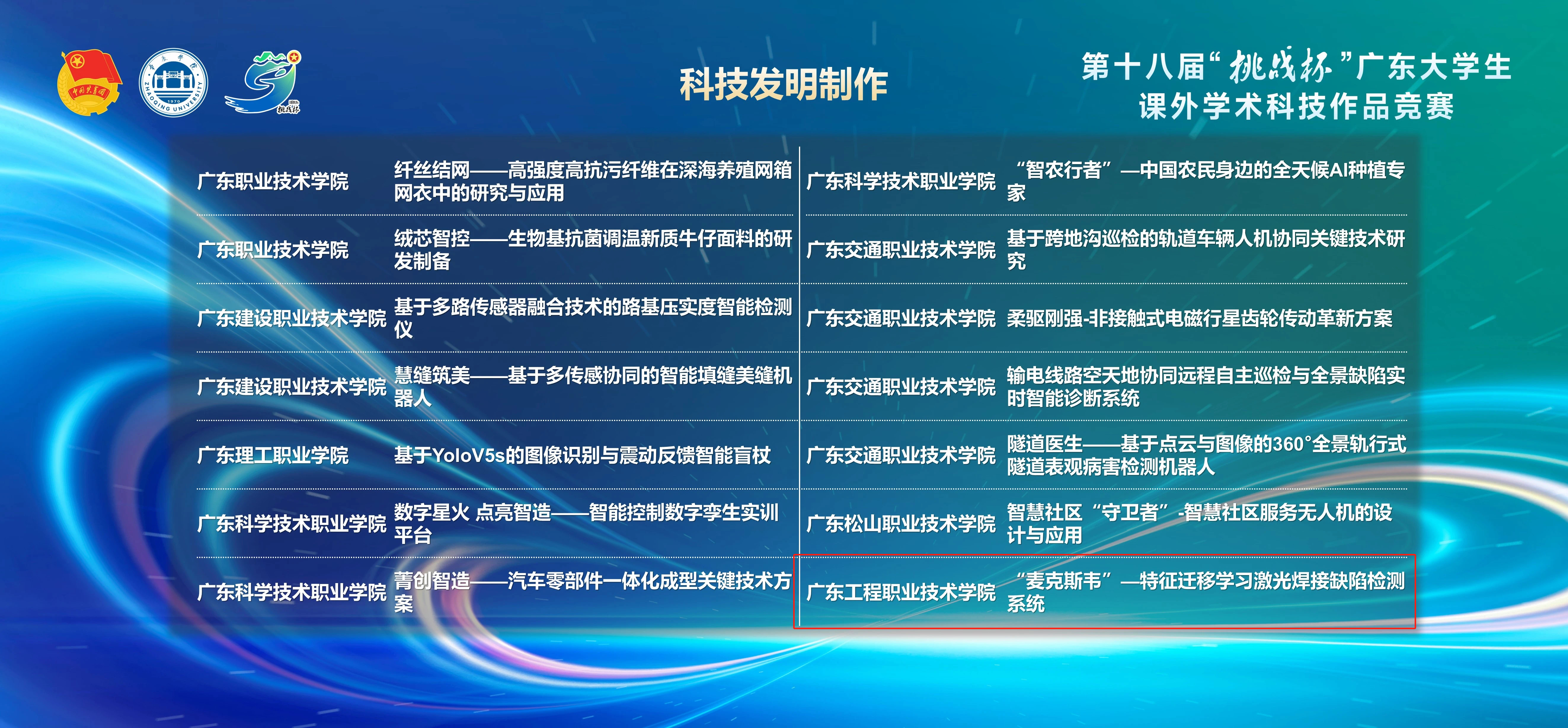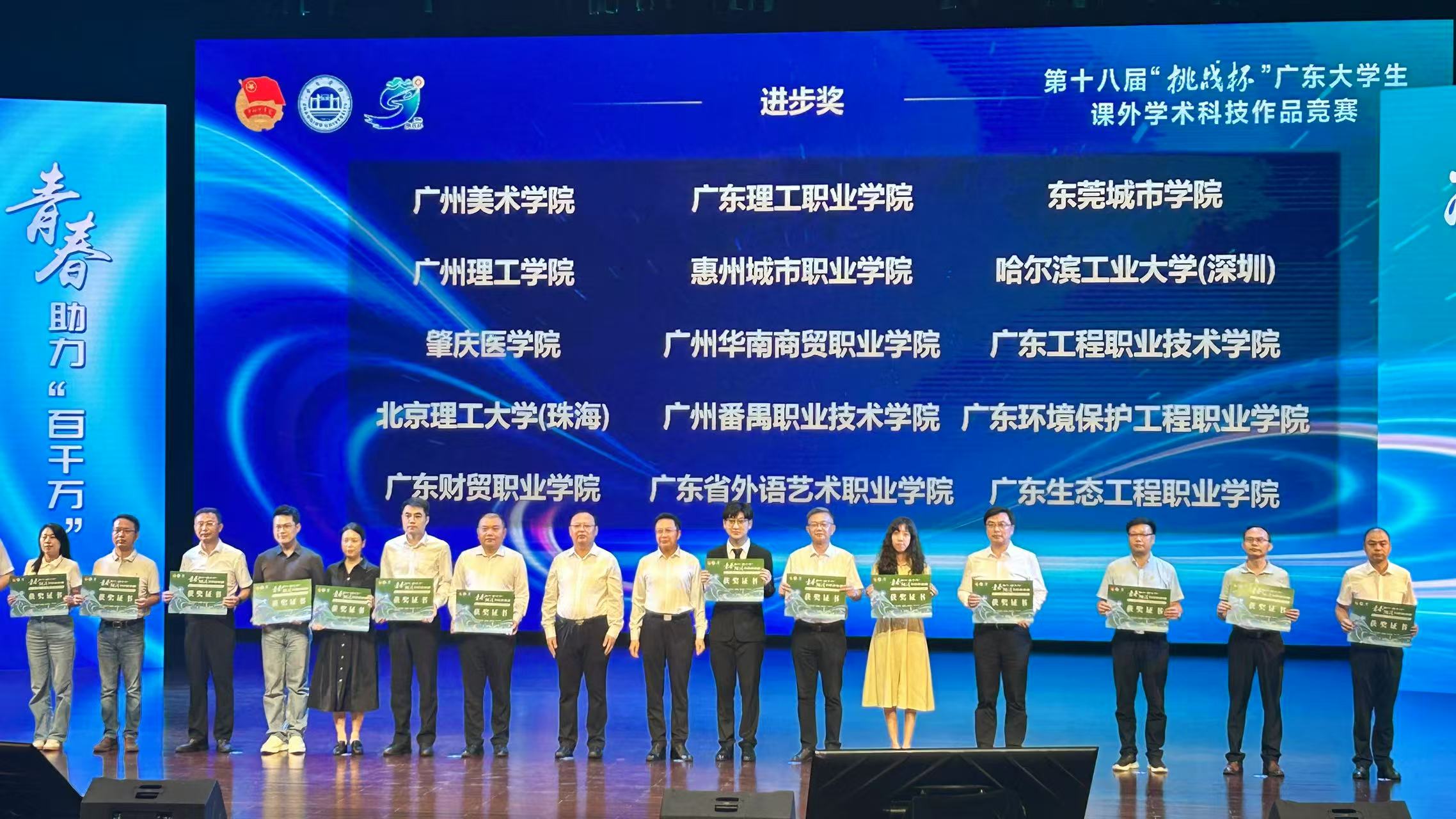 5月17日至5月19日,第十八届“挑战杯”广东大学生课外学术科技作品竞赛终审决赛在肇庆学院落下帷幕,此次竞赛全省161所高校共3.6万余件科创作品参加,科创实践覆盖逾20万名大学生,参赛人数和作品数均创历史新高,最终有831个项目进入全省终审决赛。我校共推送12项作品参加省赛主体赛,经过激烈角逐,最终荣获一等奖2项、二等奖2项、三等奖7项,另获肇庆专项赛三等奖1项,学校也首次荣获“进步奖”。