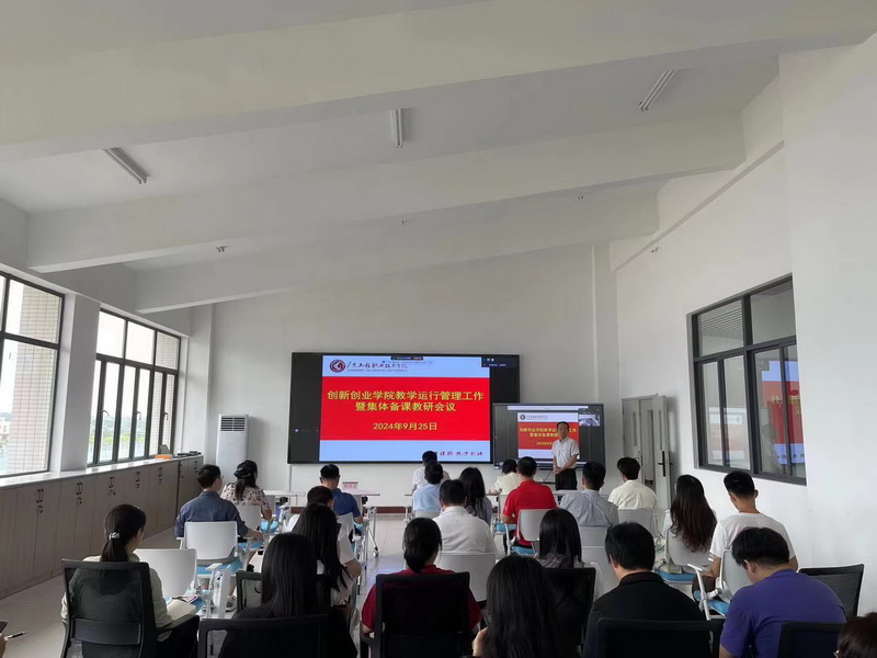 近日,为认真做好新学期各项教学管理工作,提高课程教学质量,创新创业学院在广州校区和省职教城(清远)校区双创基地路演大厅召开教学运行管理工作暨集体备课教研会议,会议由创新创业学院副院长兼教研室主任何杰文主持,《创新创业基础》和《就业与创业指导》课程全体任课教师参加了会议。