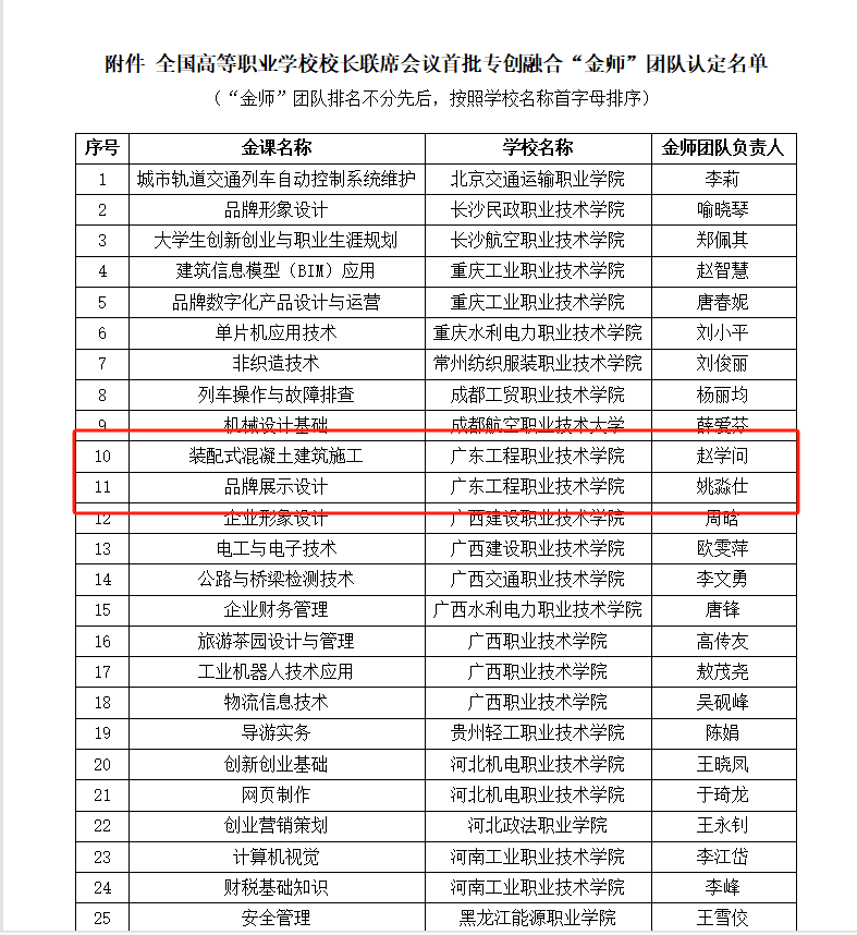 近日,全国高等职业学校校长联席会议双创教育专委会公布首批专创融合“金师”团队名单,我校 《装配式混凝土建筑施工》、《品牌展示设计》凭借出色的专创融合教学实践,从 510 个申报团队、经遴选后的 100 个团队中突围,成功入选全国 60 个首批专创融合“金师”团队,与北京交通运输职业学院等优秀院校教师团队并肩。