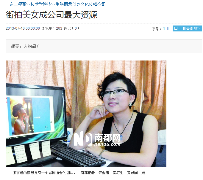 张丽君,管理工程学院2009级经济管理(房地产经营与物业管理)班毕业生。2011年4月,刚上大二的她组建了“猛狮团队”,参加“红冠杯”全国大学生创业营销实战大赛勇夺冠军,2012年3月,还未毕业的她就组织团队创办了广州狮说文化传播有限公司,落户广州市海珠区创业园。张丽君创业的决心、勇气、激情成就了自己的成功,她的敢闯敢拼的创业精神和创业历程是当代大学生的典型,非常值得在校大学生学习。