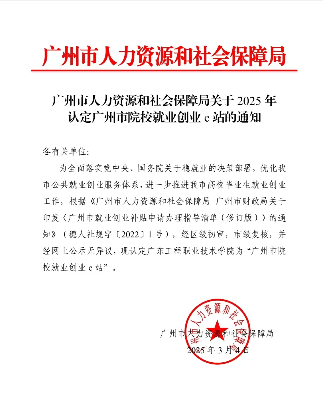 链接:就业创业e 站是广州市人力资源和社会保障局为深入贯彻落实党中央、国务院关于促进高校、职业院校、技工院校毕业生就业创业决策部署,持续做好广州市毕业生就业创业工作而在属地是广州市的高校内建立的e站。202474日,该局发布《广州市人力资源和社会保障局关于开展2024年院校就业创业e 站工作的通知》,通知规定的实施程序包括:学校向属地所在区人力资源和社会保障局提交申报材料、区人力资源和社会保障局进行初审评估、评审复核、公示公布、资金拨付。20241218日下午,广州市天河区劳动就业服务管理中心副主任黄少冰一行莅临广州校区考察就业创业e站新建站情况给予高度评价,并经市级复核、网上公示无异议,然后发布立项通知。