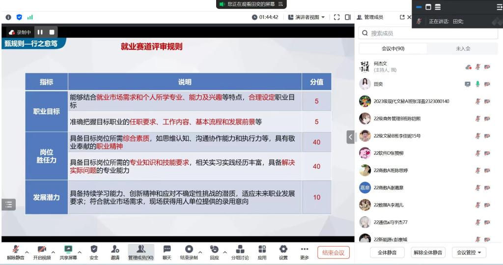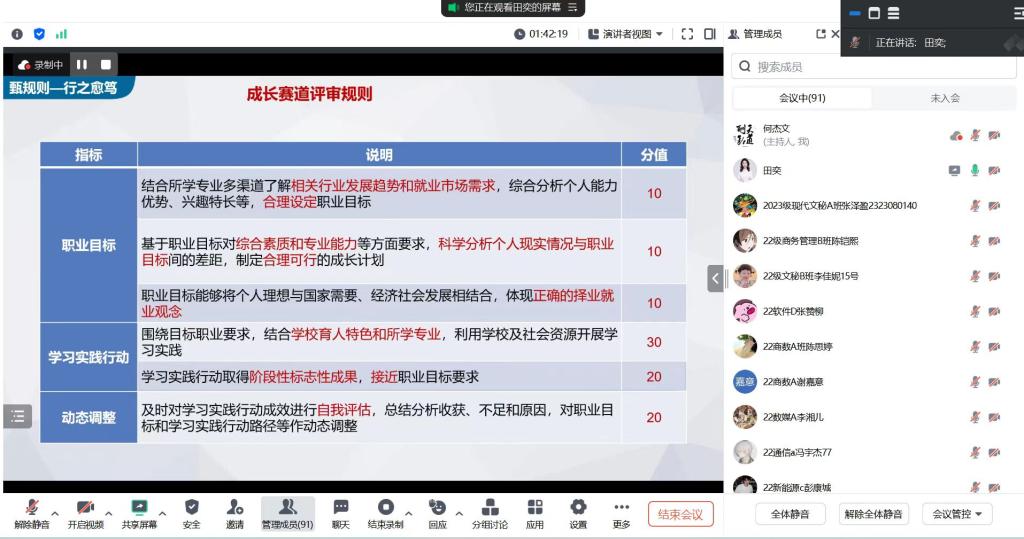 辅导会上,创新创业学院副院长何杰文首先向参会的师生们介绍了第二届全国大学生职业规划大赛相关内容和比赛规则,同时还组织了我校参加首届全国大学生职业规划大赛并获得省赛银奖的蔡慧欣和余雪雯两名参赛选手分享了参赛经验。随后,大赛辅导专家何贞老师从企业高管的角度,紧密结合首届全国大学生职业规划大赛中国赛获奖选手案例,对成长赛道和就业赛道的评审规则进行了详细的讲解和备赛辅导,指明了如何进行科学合理的职业生涯规划,并提供了详尽的备赛建议,可谓“干货满满”。