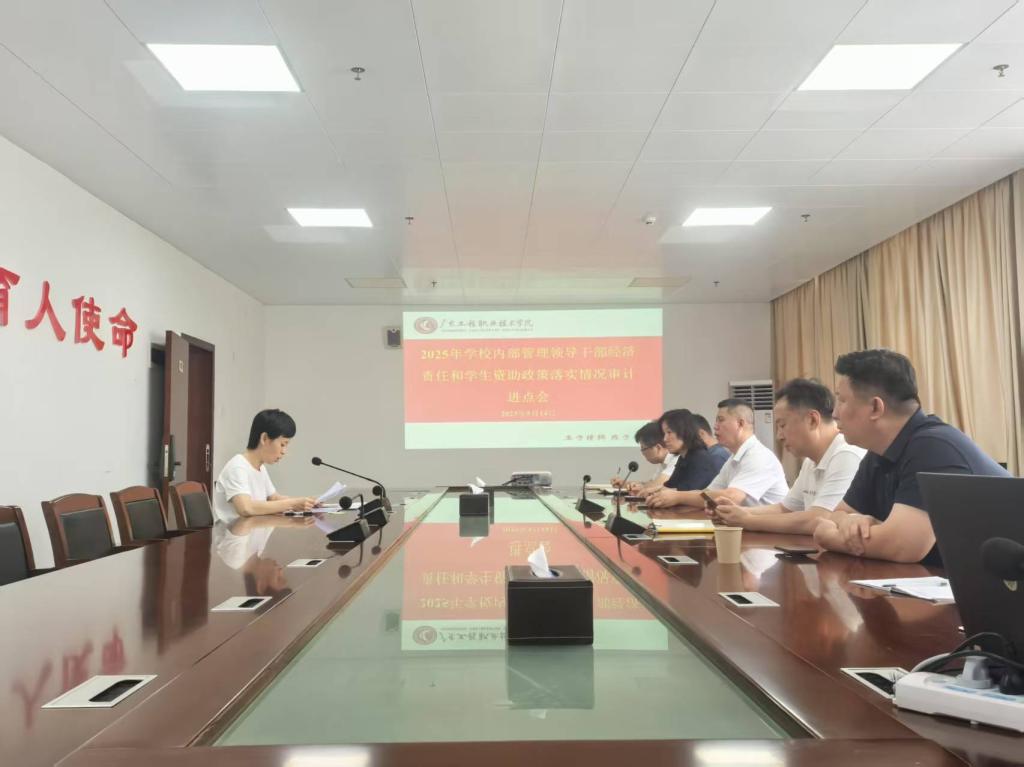 2025年5月14日上午,学校在广州校区办公楼615室和省职教城校区办公楼411室连线召开2025年学校内部管理的领导干部经济责任和学生资助政策落实情况审计进点会议。学校相关职能部门负责人、经济责任被审计对象代表及其原所在单位负责人、审计组成员、第三方审计机构代表参加了会议。会议由党政办公室(审计工作部)主任梁英主持。