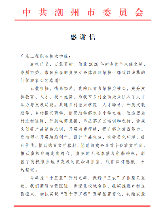 2026年2月12日,我校收到来自中共潮州市委、潮州市人民政府的两封感谢信。信中,潮州市委、市政府对我校五年来倾情帮扶潮州市饶平县饶洋镇,助力当地乡村全面振兴所做出的贡献表示衷心感谢,并向全体教职员工致以诚挚的新春问候。