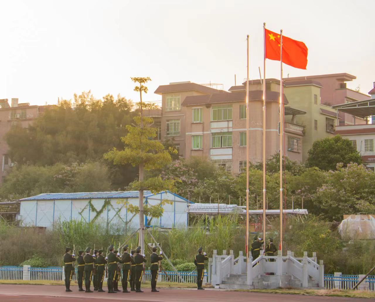 沐浴着和煦的晨光,国旗班的旗手们迎着朝阳,以饱满的热情,庄严地护卫五星红旗。当雄壮有力的《义勇军进行曲》响彻了整个校园时。同学们集体行注目礼,全场弥漫着一种庄严肃穆的气息。伴随着一缕缕微风,国旗不断向高处飘扬,迎风招展的姿态鼓舞了我们不变的坚持,热烈张扬的艳丽荡涤了我们激昂的襟怀。