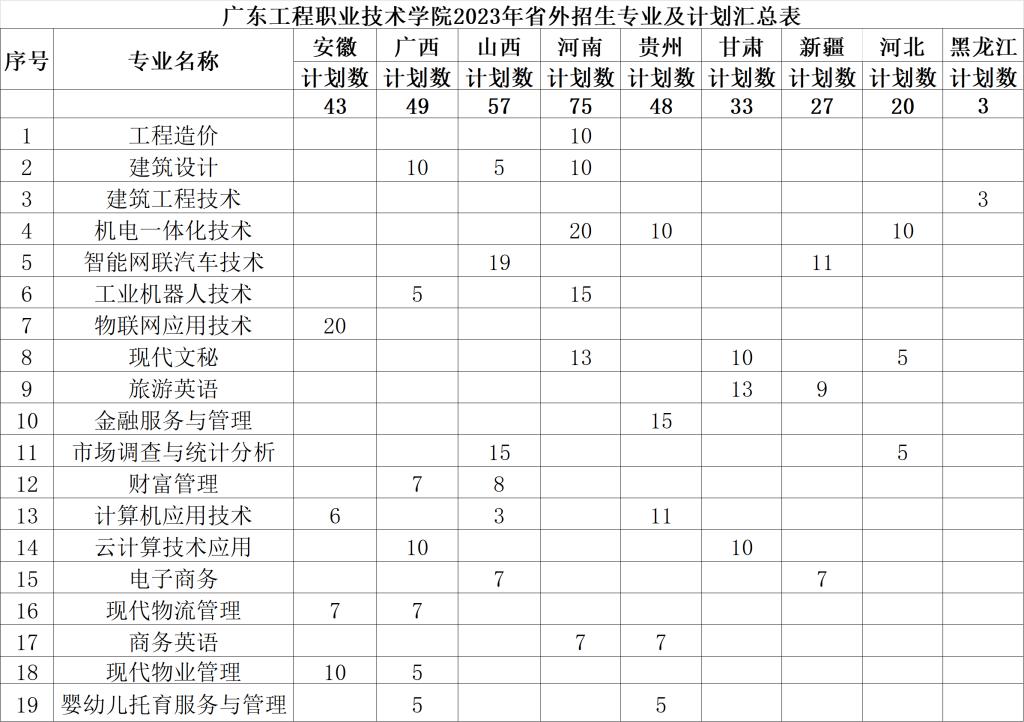 广东工程职业技术学院2023年省外招生专业及计划汇总表