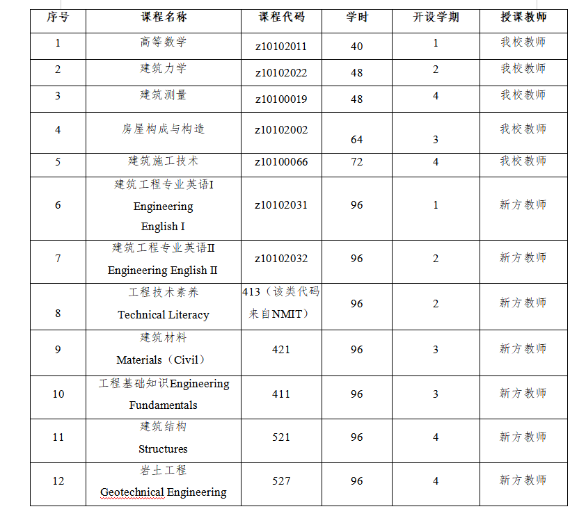 本专业共开设8门专业基础课和4专业核心课,其中尼尔森马尔伯勒理工学院教师承担7门,由尼尔森马尔伯勒理工学院委派教师来我校组织教学,并负责教学质量,我方教师承担5门课程,由双方共同实施教学管理和质量评估。课程设置情况如下表:
