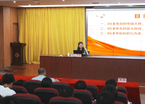 李丽校长围绕伟大抗战精神主题,以习近平总书记在纪念中国人民抗日战争暨世界反法西斯战争胜利80周年大会的重要讲话精神为切入点,以历史时间为线索,从三个方面展开阐述:一是回顾历史,80多年前的中国人民,如何铸就伟大抗战精神?二是重温80年来的革命奋斗历程,我们国家如何传承伟大抗战精神?三是立足新时代,职校青年又是如何弘扬伟大抗战精神、如何用技能成就梦想?