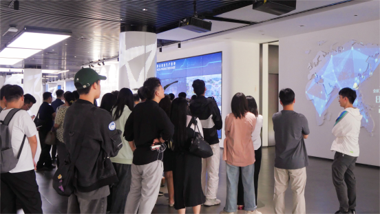 在中德工业服务区(三龙湾)园区展厅,学生们跟随讲解员认真聆听三龙湾的建设历程及发展规划,同时通过观看展厅内的图片、文字、影像,了解了中德工业服务区在对外合作、搭建重大平台项目、举办国际化品牌活动、服务企业双向交流等方面的情况,直观感受到粤港澳大湾区科技发展和先进生产力。