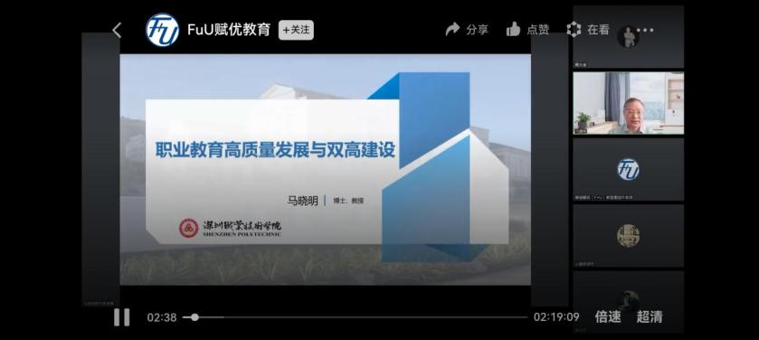 为进一步推动省域高水平高等职业院校建设,助力学校中心工作的开展和满足广大教职工的学习需求,国际教育学院会同人力资源部主动对接优质资源,发挥德国赋优(F+U)教育集团的平台优势,举行3期精彩纷呈的专题讲座。此次培训邀请了原深圳职业技术学院副校长马晓明教授、华南师范大学教育科学学院院长李盛兵教授、华南师范大学职业教育学院院长刘志文教授等职业教育专家,以“云课堂”模式进行网络直播授课,主题为“职业教育高质量发展与‘双高’建设”、“英、美国家职业教育体系分析和案例解读”、“高职院校教师高水平教学研究论文撰写与发表指导”。专家们利用专业的理论、生动的案例和详实的数据启发学员们对职业教育国际化工作展开思考。在互动环节,学员们纷纷表达此次培训使他们受益匪浅。