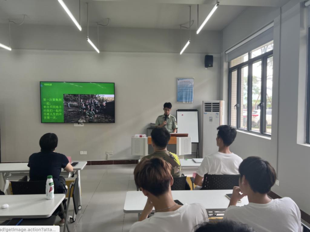 何月华传达了学校征兵工作会议精神,介绍了2022年秋季大学生征兵入伍工作具体要求,从大学生征兵流程、经济补助、政策优待等多方面进行解读,详细介绍了入伍、复学、提升学历、就业、公务员招考等方面的优待政策。2021级智慧旅游与应用A班林泽凯讲述了自己由一名大学新生成长为一名“四有”优秀士兵再到优秀大学生的转变历程,分享其从刚入伍时的青涩转变为部队骨干的不懈努力以及在军营中精彩生活,“我希望大家踊跃参军入伍,在国家的强军梦中实现自己的人生理想目标,入伍后手握钢枪,保卫祖国;退伍后退伍不褪色,不忘初心,继续保持那抹军绿色的优良作风。”林泽凯激动地对大家说道。