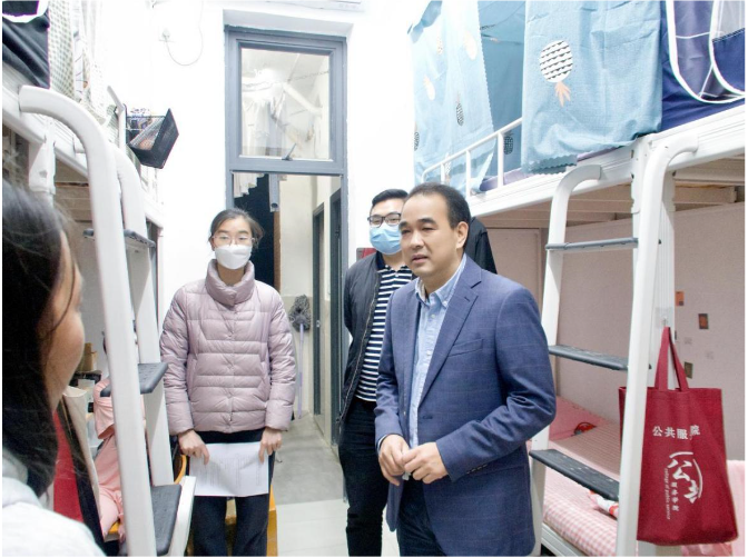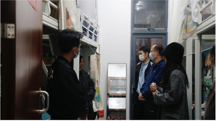 为落实学校疫情防控要求和疫情防控专班会议精神,筑牢校园安全防线,全面了解近期学生健康情况和思想动态,共同保障全体师生安全,2022年11月30日,公共服务学院党总支书记吴文丰、副院长黎惠忠和全体辅导员深入学生宿舍走访,向同学们传达学校疫情防控政策要求,了解线上教学效果,及时帮助学生解决遇到的实际困难和问题。