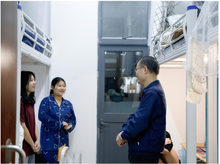 走访过程中,老师们表达了对学生的冬日慰问与关切,对学生的学习、生活、宿舍安全等方面进行了深入细致的交流。吴文丰强调目前疫情形势依然严峻复杂,坚持就是胜利,希望同学们继续严格遵守学校各项疫情防控措施,时刻关注疫情变化,做好必要防护;提醒同学们要利用业余时间加强锻炼,高度重视宿舍的安全和卫生,勤开窗通风,保持宿舍干净整洁,积极参加学院组织的宿舍文化建设活动。黎惠忠副院长重点了解同学们疫情期间的线上学习情况,回应同学们提出的问题建议,学院将继续关注,尽全力保障同学们的学习需求。