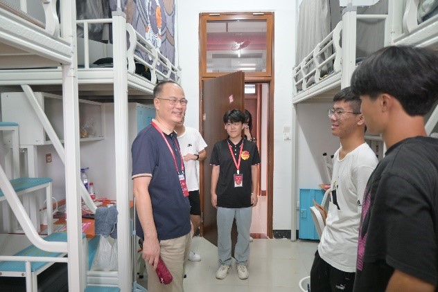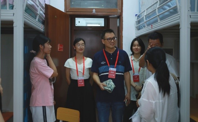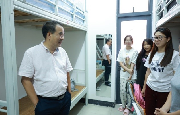 随后,学院领导携辅导员、班主任及学生骨干,深入宿舍走访新生。在宿舍访问过程中,学院领导和老师们与新生进行了真挚交谈,仔细了解了新生对于校园设施、教学培养以及宿舍生活条件的意见与建议。学院领导和老师表示,学院将全力以赴,为每一位新生营造一个舒适和谐的生活环境。同时也对新生深情寄语,希望大家能够珍视彼此间的缘分,相互尊重与理解,培养健康的生活习惯,以饱满的精神状态迅速适应大学生活,以充足的信心迎接新学期的旅程。