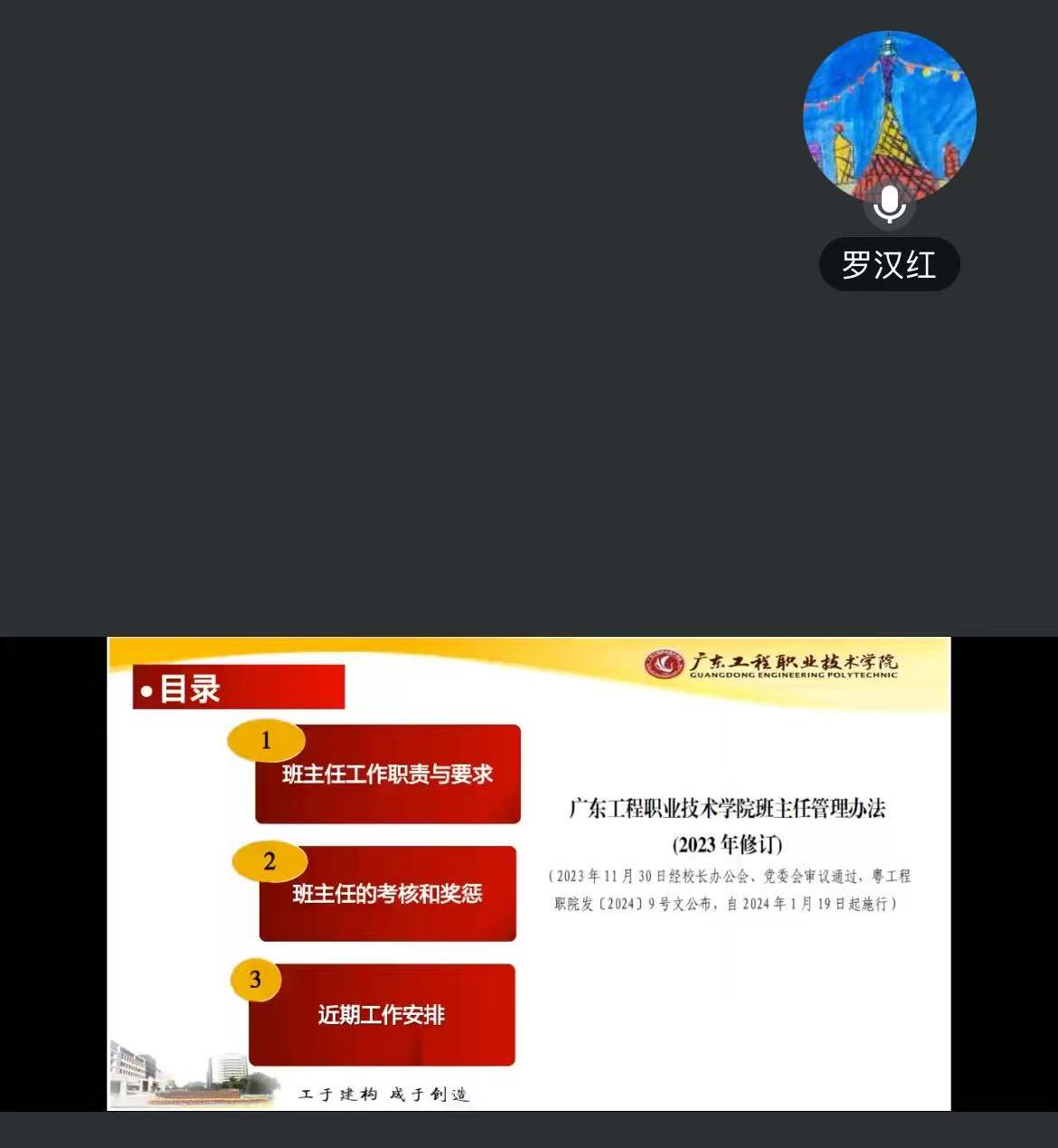 会议伊始,罗汉红传达了学校关于班主任队伍建设的总体要求,并解读了《广东工程职业技术学院班主任管理办法》。她强调,班主任是学生成长成才的“引路人”和“护航者”,必须履行好岗位职责:一是做实思想引领,定期开展谈心谈话,关注学生思想动态及心理健康;二是抓好班级建设,落实好班会课、宿舍走访工作,及时掌握学生异常情况;三是强化职业指导,结合文旅专业特色,助力学生职业规划与技能提升。会上,结合学校要求和学院实际,对近期班主任工作进行部署。