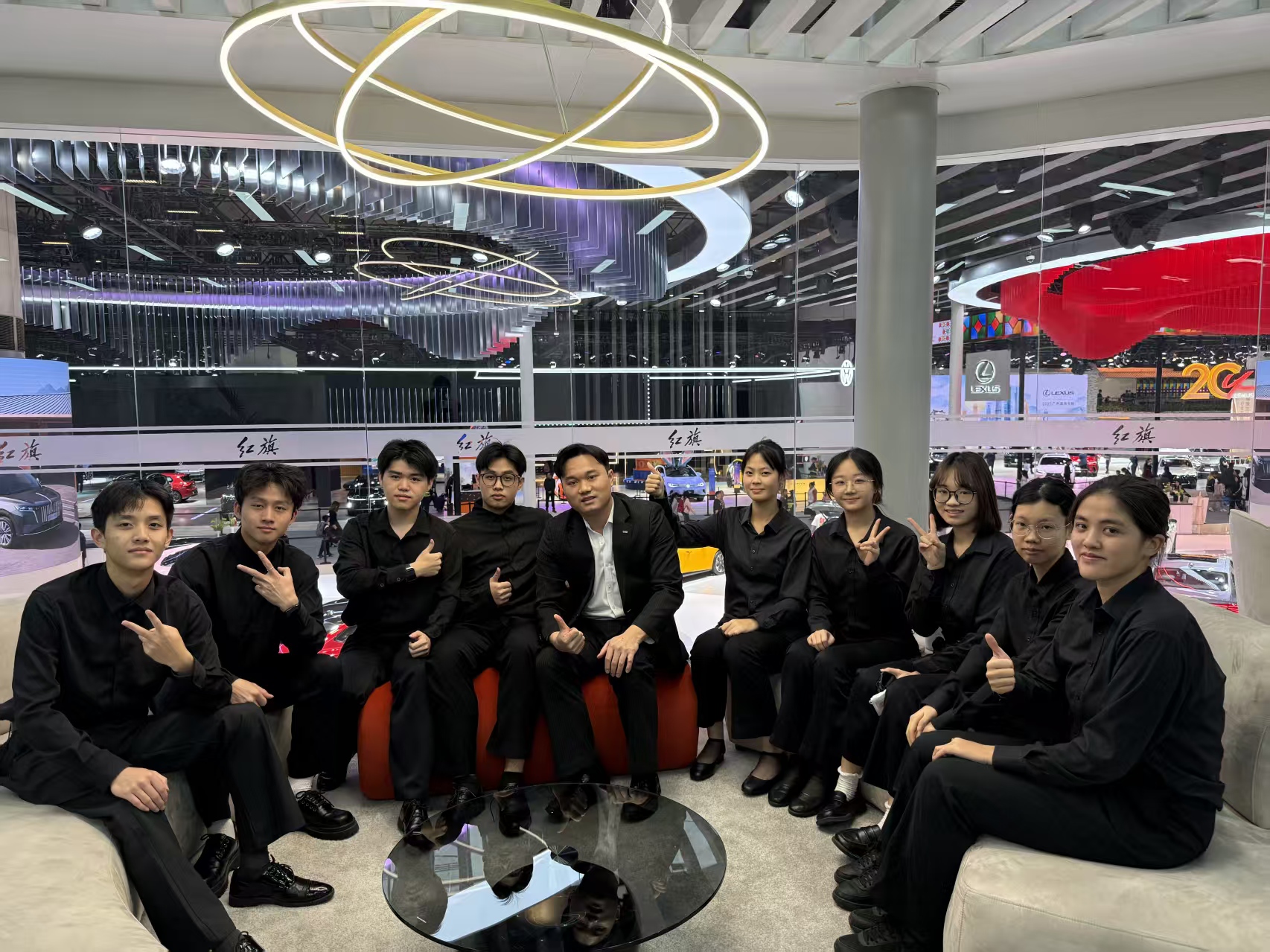 实习生巩雪儿同学感慨道:“本次车展见习我收获颇丰。从初期面对工作的生疏不适,到后期逐步熟练、游刃有余,这一成长离不开领队的悉心指导与小伙伴们的热心相助。此次经历更让我深刻认识到,会展并非表面所见那般简单,其成功背后是全体工作人员的协同发力——从展台搭建到后勤保障,每个环节均环环相扣、至关重要。这次见习不仅让我对会展行业的实际运作建立了直观认知,更深化了对会展策划与管理专业的理解,也为未来的专业技术学习明确了方向。”实习生王泽敏同学则分享道:“在车展实习的日子,让我对“专业服务”有了全新认知。我从咖啡特调的配比练习,到熟记点单、出餐的完整流程;从按时摆放茶歇甜点,到时刻关注物料库存、及时补货,每一个细节都藏着服务的门道。当外国友人因语言不畅面露难色时,我主动上前耐心交流,帮他们选到合心意的饮品,当看到他们满意的笑容,我真正读懂了“以客户为中心”既是技能的精准,更是服务的温度。”