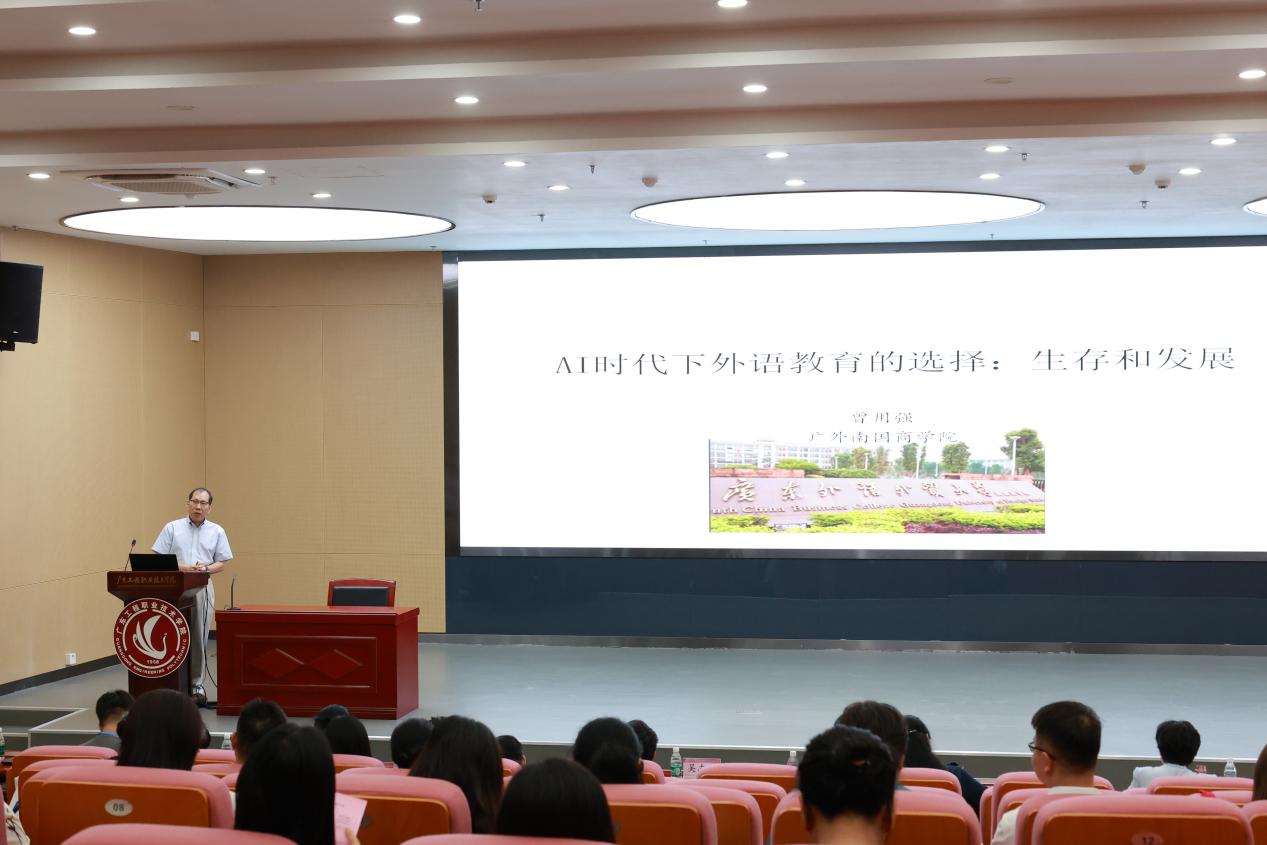 开幕式后,本次研讨会的报告内容丰富多样,涉及AI时代下外语教育的选择:生存和发展、大学英语课程思政育人体系探索与实践、产教融合与高职外语生态圈进化论的观点、职业高职外语教学实施与规划等多个议题。广东外语外贸大学南国商学院曾用强副校长发表了题为《AI时代下外语教育的选择:生存和发展》的主旨报告,深入探讨了现代科技对外语教育的影响和未来发展方向。他认为AI的发展对外语教育是威胁同时也是赋能,要利用好AI赋能外语教育,如在语音识别、口语(或写作)自动评分、知识图谱自动生成、学习辅导等领域加强合作与发展,在平常教学中赋予AI新技术的应用和实践。