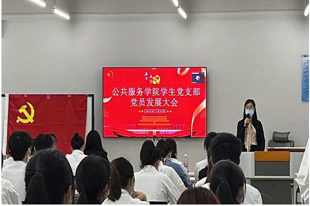 2022年11月24日,公共服务学院学生党支部在教学楼Q4﹣109召开了党员发展大会,参加本次大会的有公共服务学院学生党支部全体党员及27位发展对象,大会由支部书记许世娟主持。