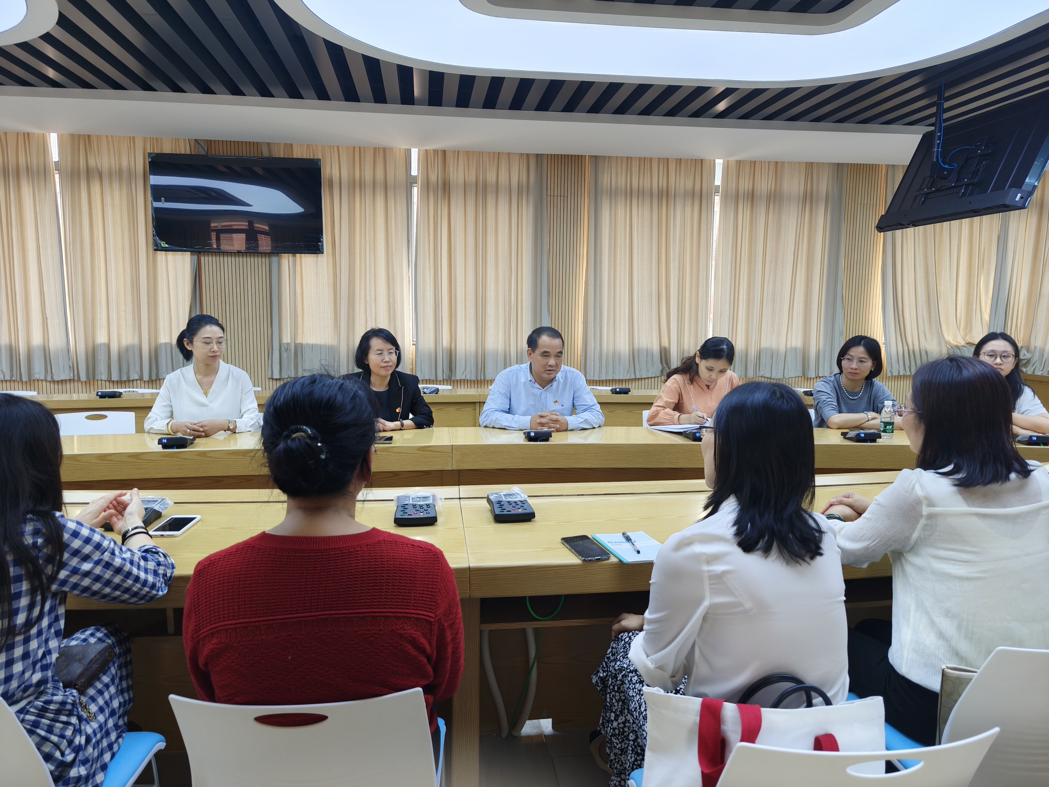 座谈会上,双方代表分别介绍了各自党支部的基本情况、组织架构以及在党建工作方面的特色做法。公共服务学院教师第二党支部书记董建霞、学院党委书记吴文丰分别介绍了我院在党员教育管理、思想政治引领、党建与业务融合等方面的积极探索和取得的成效。清远职业技术学院英语专业教师党支部书记唐恩莉重点分享了他们在开展主题党日活动、创新党员服务形式、加强党风廉政建设等方面的宝贵经验。随后,双方成员就当前党建工作中的热点、难点问题展开深入的讨论,共同寻求解决方案。大家一致认为,党建工作是学校发展的重要引领,加强党支部建设和提升党员素质对于教育事业的发展至关重要,要不断激发党建工作新引擎,以高质量党建引领高质量发展。
