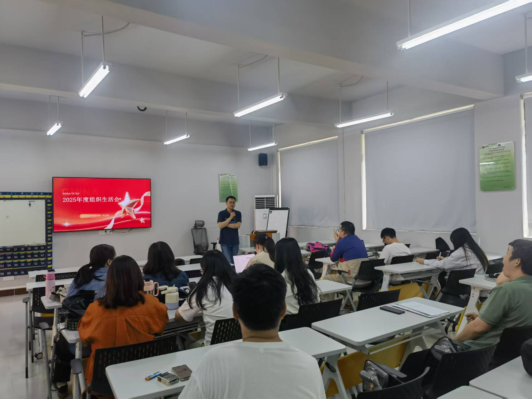 随后两个支部的党支部书记代表支委会作工作汇报,全面总结了党支部 2025 年度在理论学习、组织建设、党建与教学科研融合等方面的工作开展情况,客观查摆了支部工作中存在的问题与不足,并通报了支委会查摆问题清单及整改思路,为后续支部工作提质增效明确了方向。
