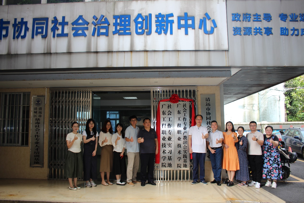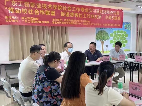 为认真贯彻落实习近平总书记在中共中央政治局第五次集体学习强调“把高质量发展作为各级各类教育的生命线”“构建多元主体参与”“推进产教融合、科教融汇,源源不断培养高素质技术技能人才”的讲话精神,为更好的推动学校“双高”建设,提升高层次人才培养质量,进一步推动产学研一体化深度融合,为学生专业实习实训和就业工作搭建实践育人、高质量合作平台。6月15日,广东工程职业技术学院公共服务学院黎惠忠副院长带领社会工作专业教师团队赴清远市益远社会工作服务中心进行了实习基地挂牌签约仪式。同时,联合清远市协同社会治理创新中心、清远市社会工作联合会、清远市清城区社会工作协会开展“广东工程职业技术学院社会工作专业实习基地揭牌仪式暨“推动校社合作联盟·促进慈善社工行业发展”主题交流会”活动。