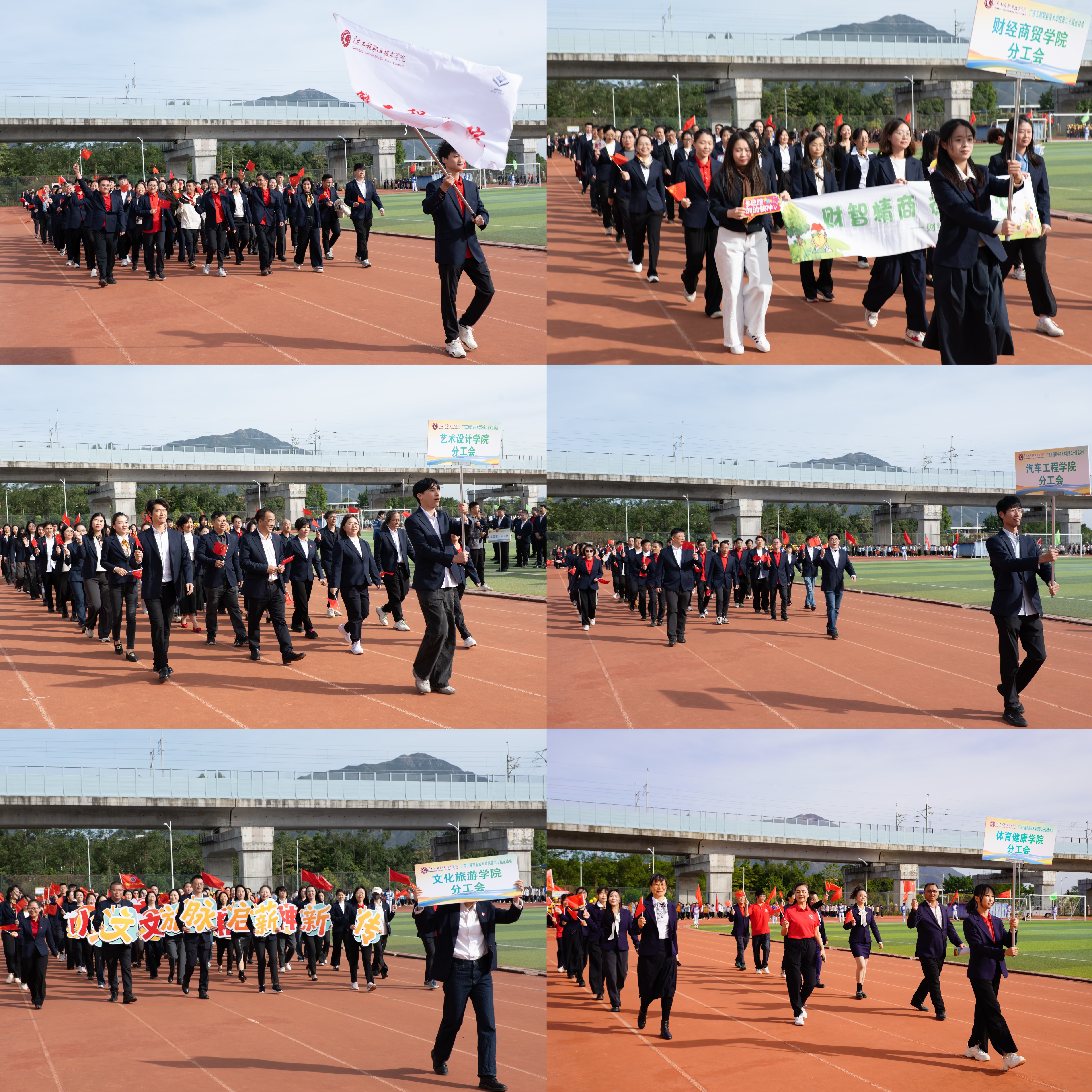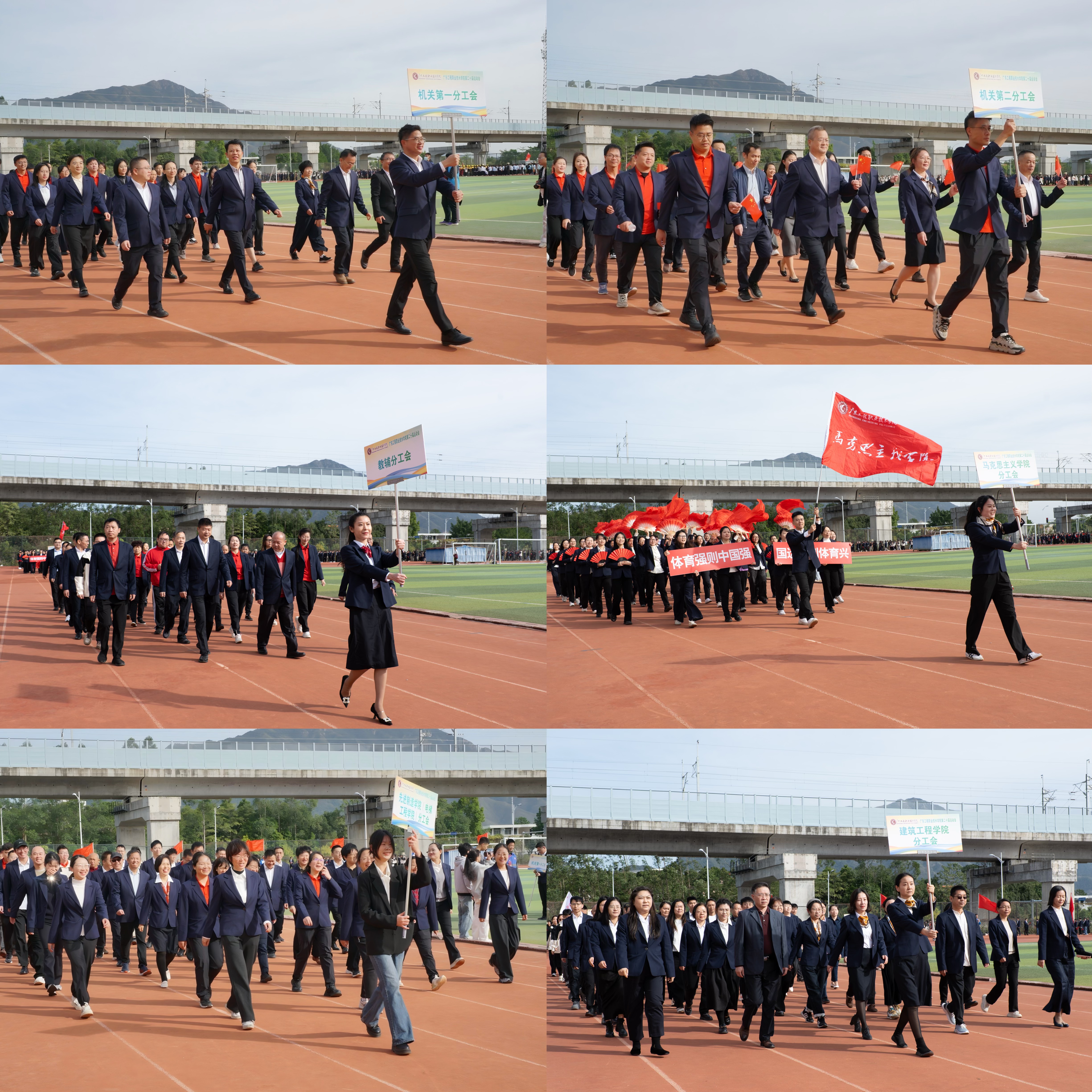 12个支分工会教职工队伍参加第二十届校运会开幕式,各方阵身着统一服装,迈着矫健步伐入场,全体教职工精神昂扬、口号响亮,尽显团结进取风貌。教职工八段锦团队、广播操团队在运动会开幕式上进行了精彩表演。