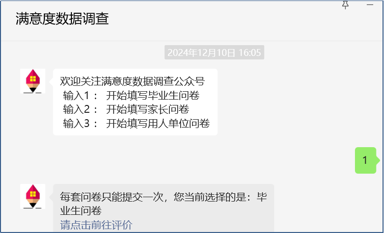 1.请毕业生、家长、用人单位关注公众号:满意度数据调查。